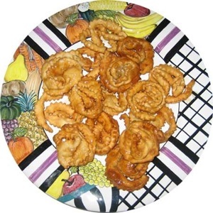 In a large heavy pot, heat olive oil to 350 degrees and fry rosettes until golden; drain on paper towels.