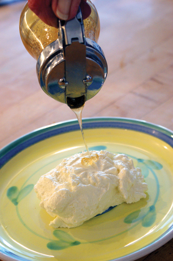 We hiked up the path and, peering through the open barn door, saw her making hot ricotta cheese in a big copper bowl over an open fire. We bought some and briskly walked back to our villa. While the ricotta was still warm, we enjoyed this delicious discovery for breakfast, topped with dark chestnut honey. However, the dish is equally delicious for lunch, dinner or dessert.
